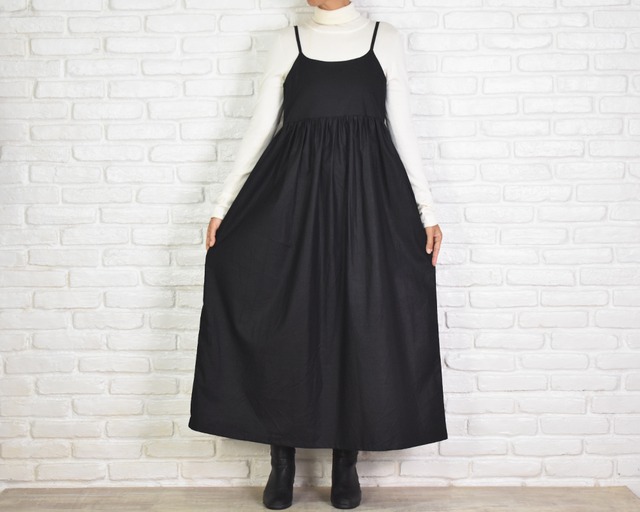 コットン素材のキャミソールギャザーワンピース ブラック 大きいサイズあり