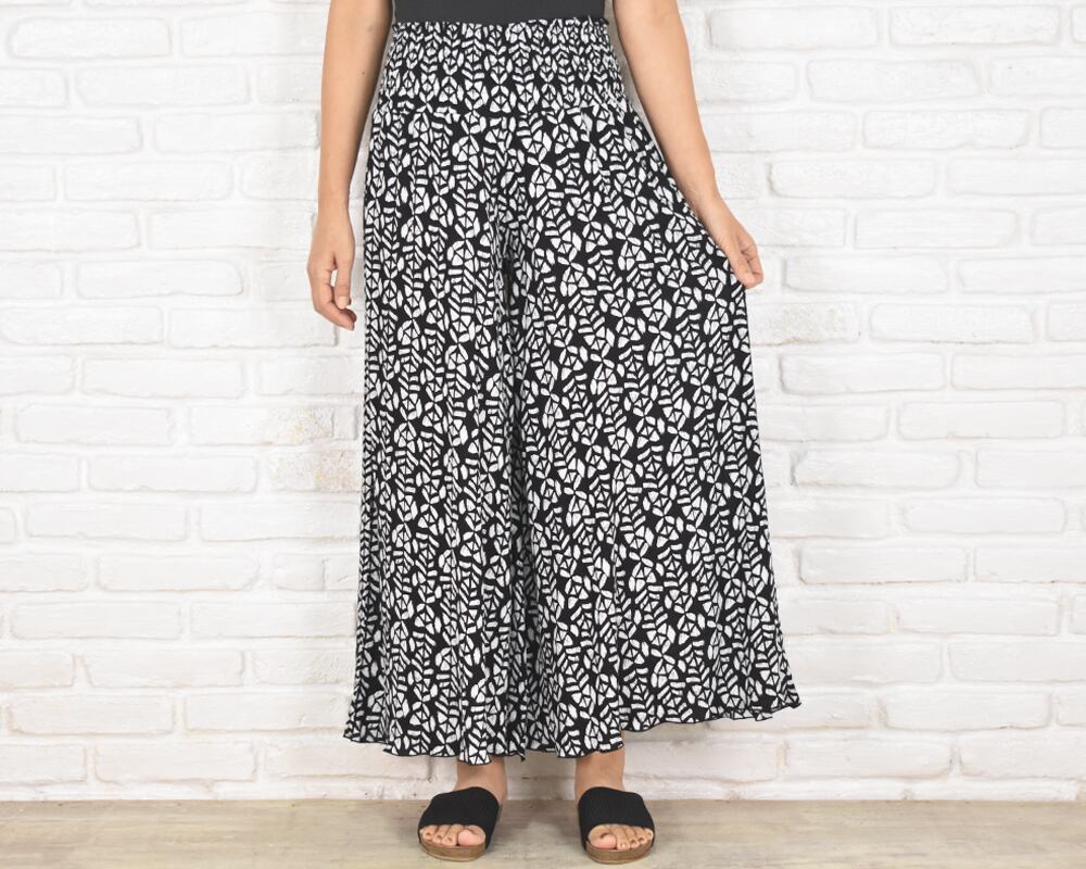 ウエストはゴムシャーリングで、ゆったりしっかり穿いていただけます。