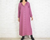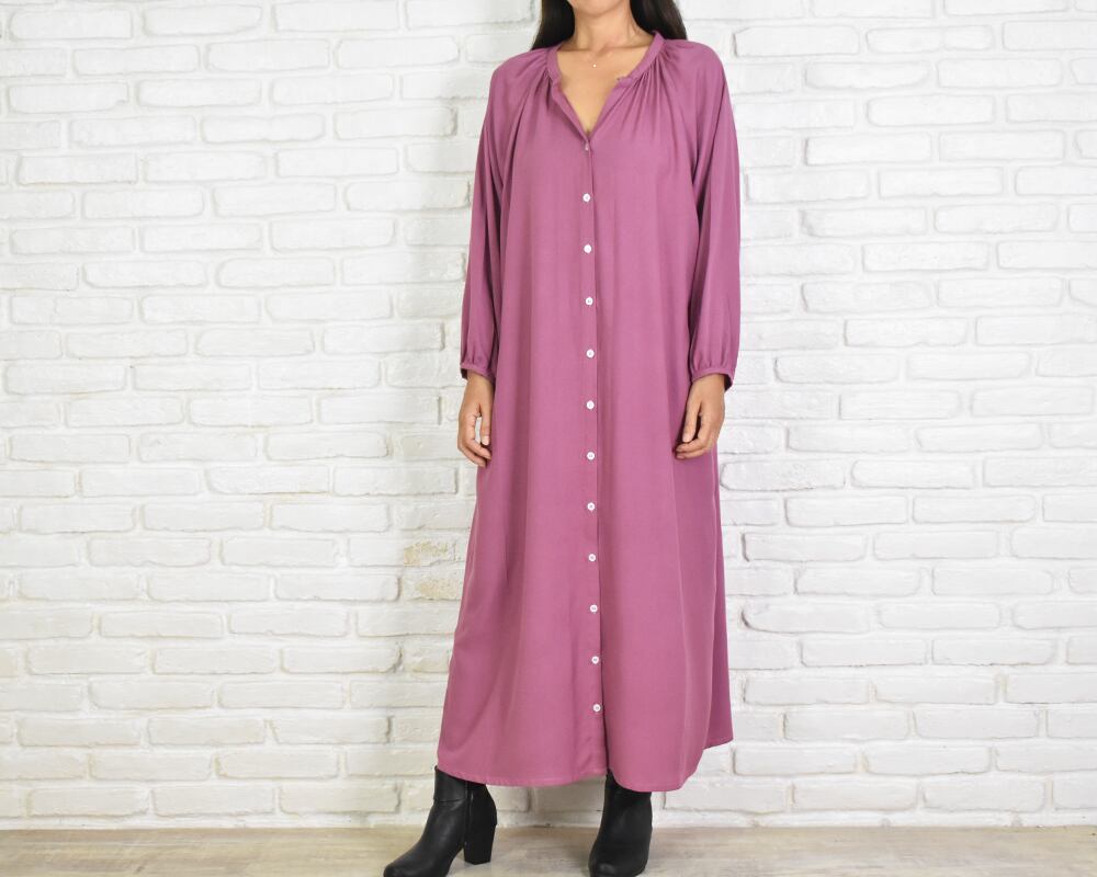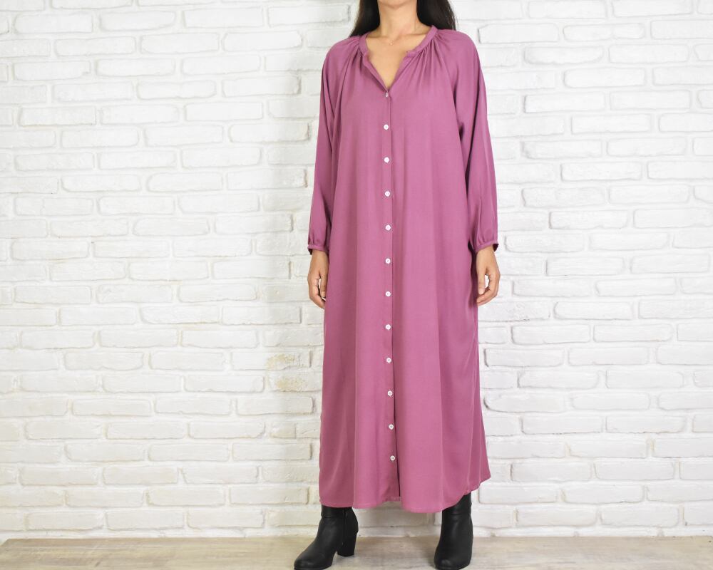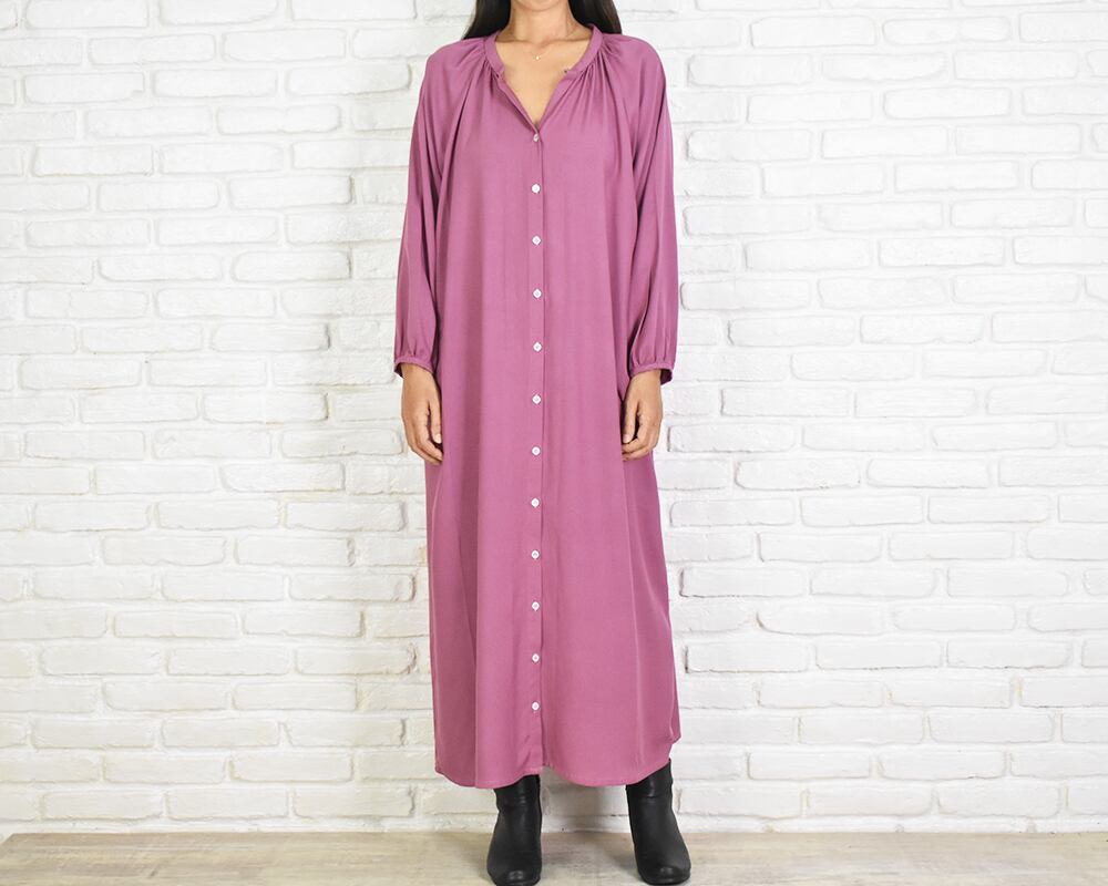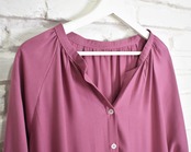 落ち着いたピンクパープル系の色味で上品さもあり大人っぽく着こなせるワンピースです。