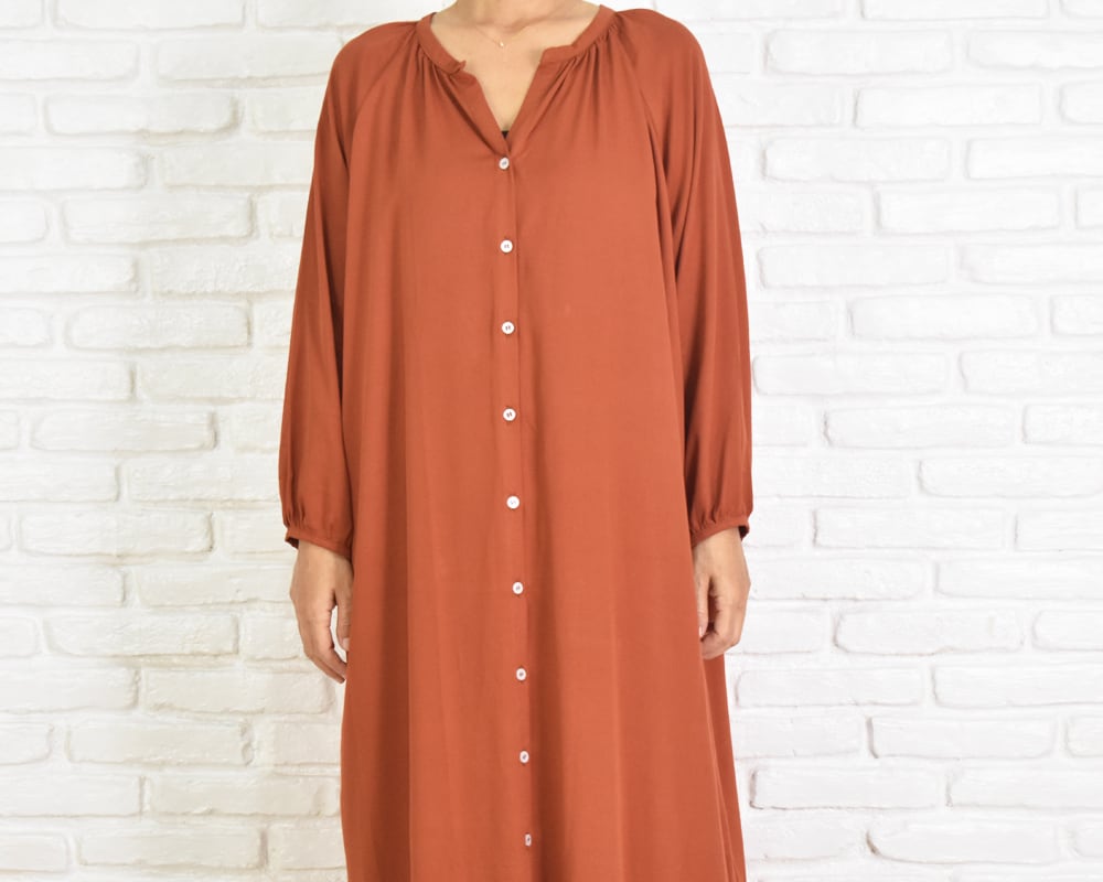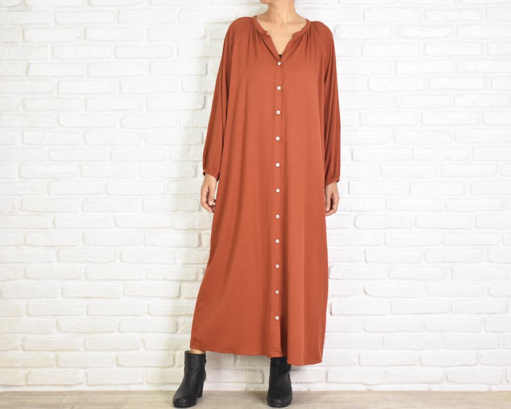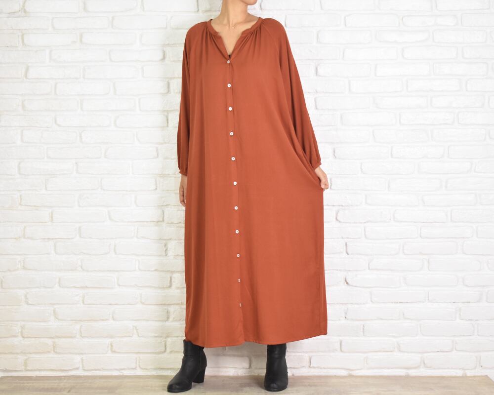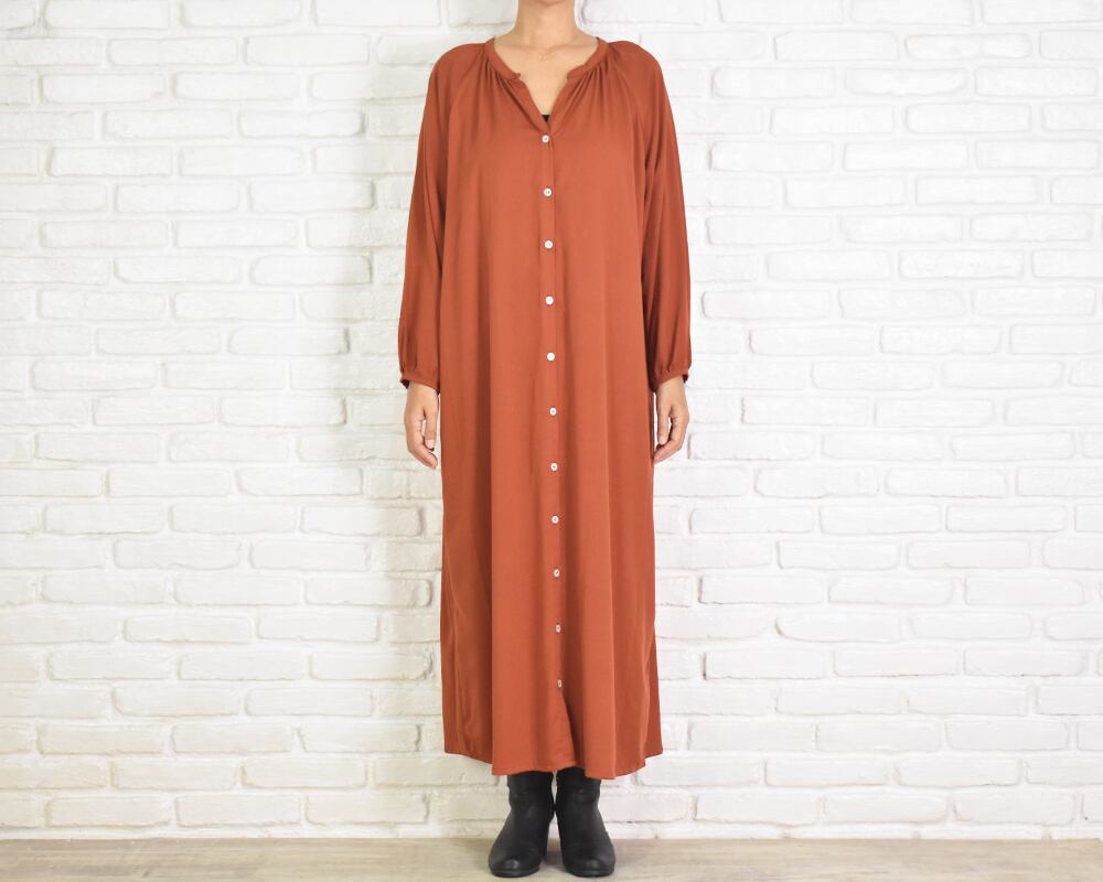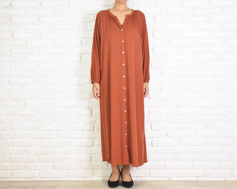 肌馴染みのよいオレンジがかったブラウン系の色味で上品さもあり大人っぽく着こなせるワンピースです。