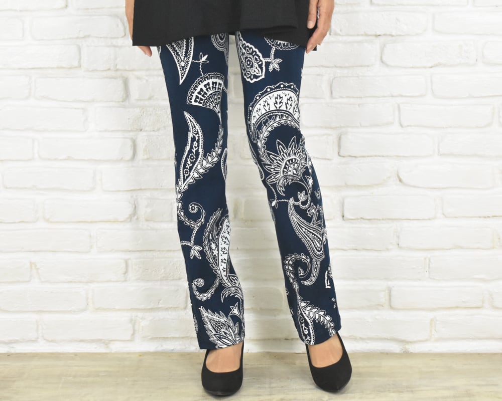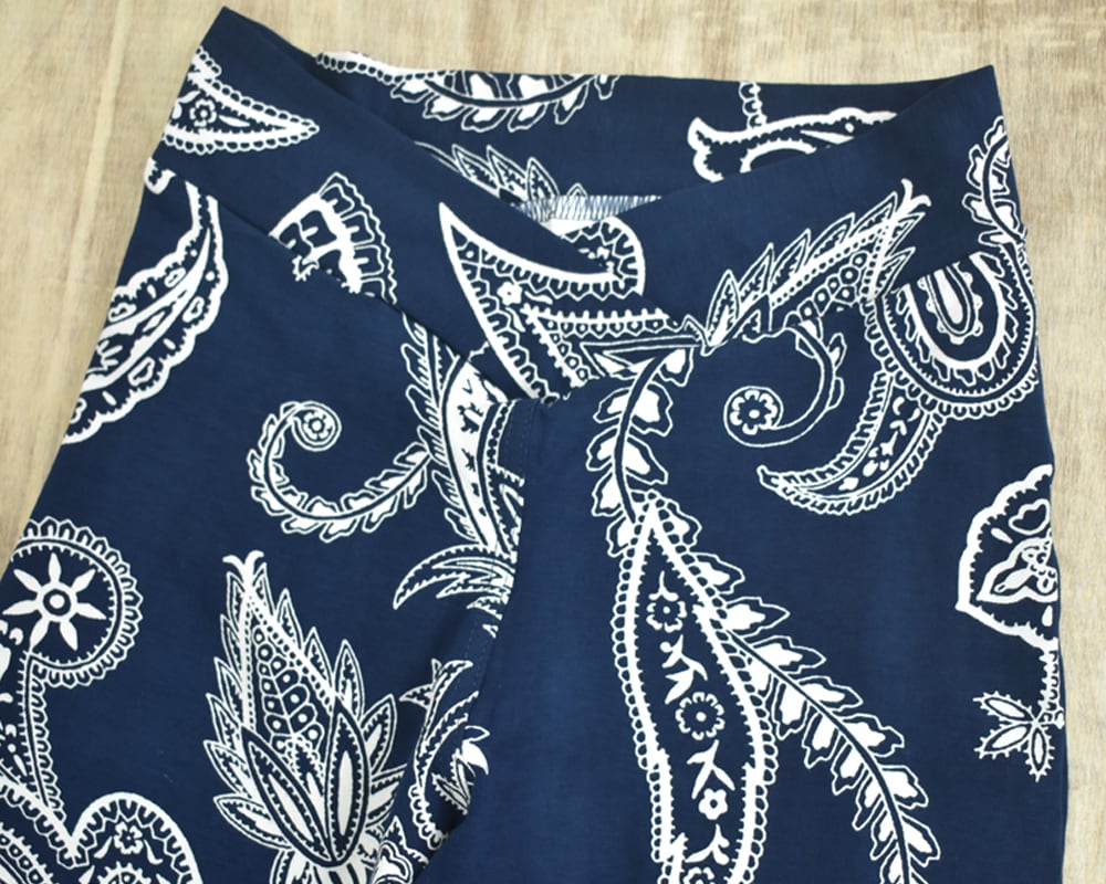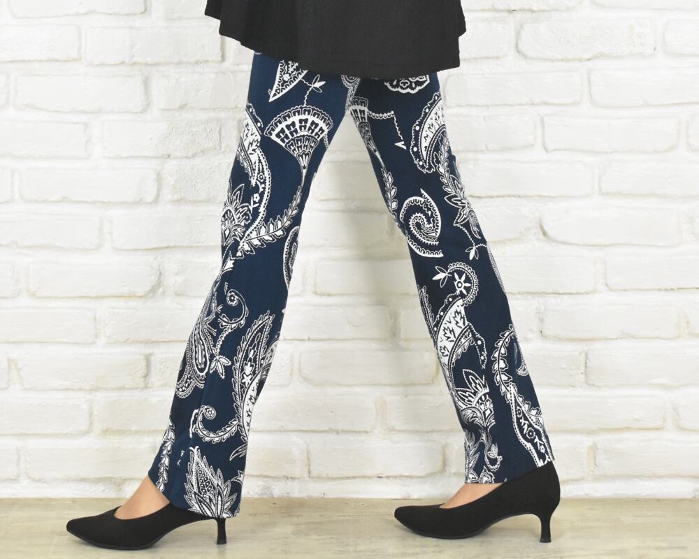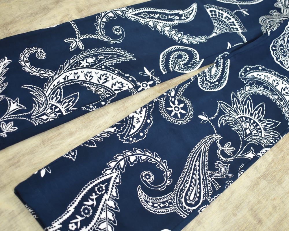 ネイビー地にホワイトの大きなペイズリー柄をあしらった、存在感のあるデザイン。