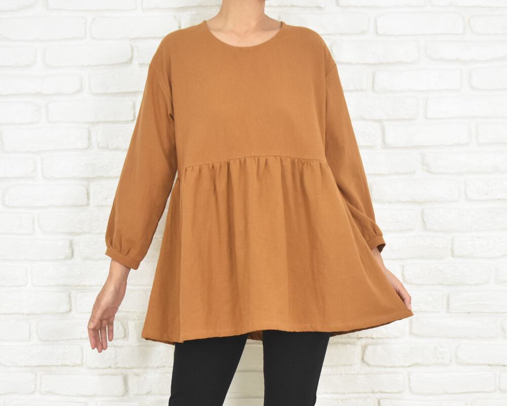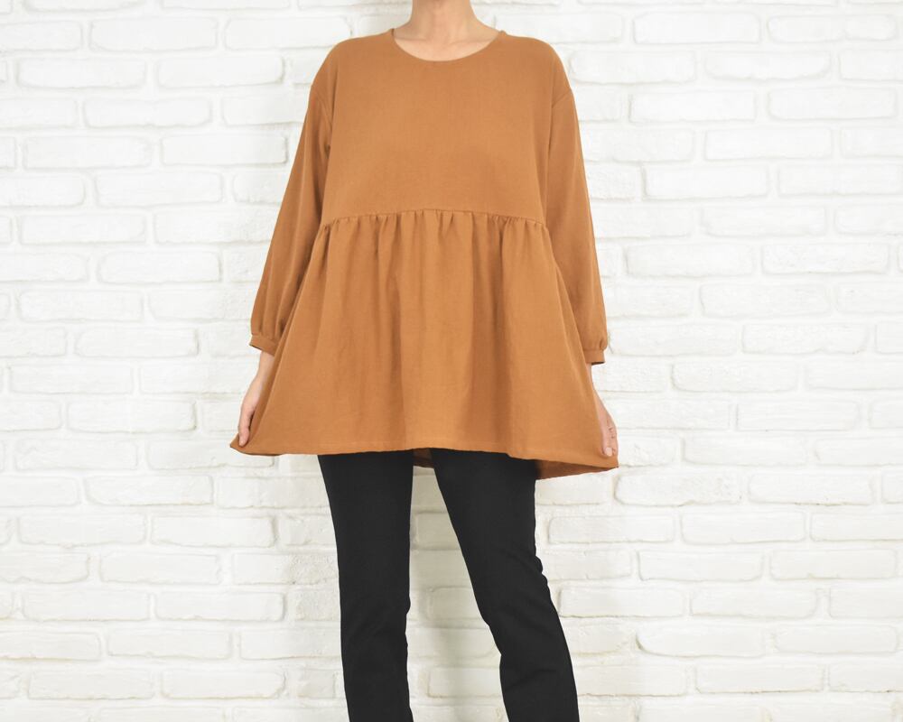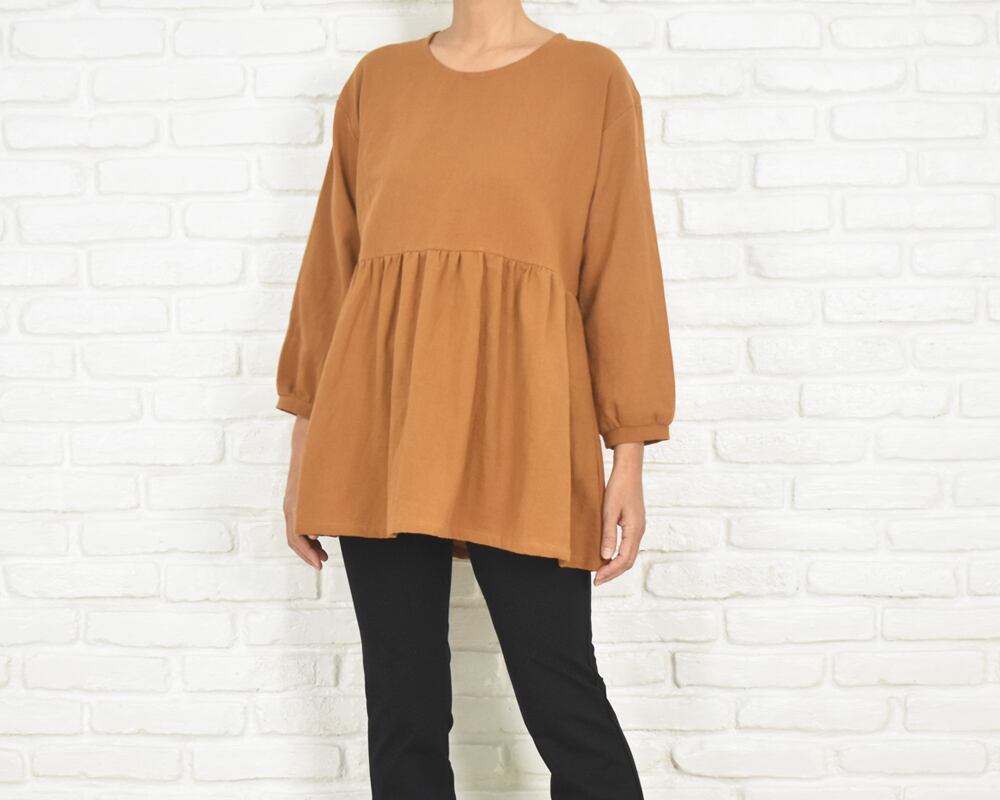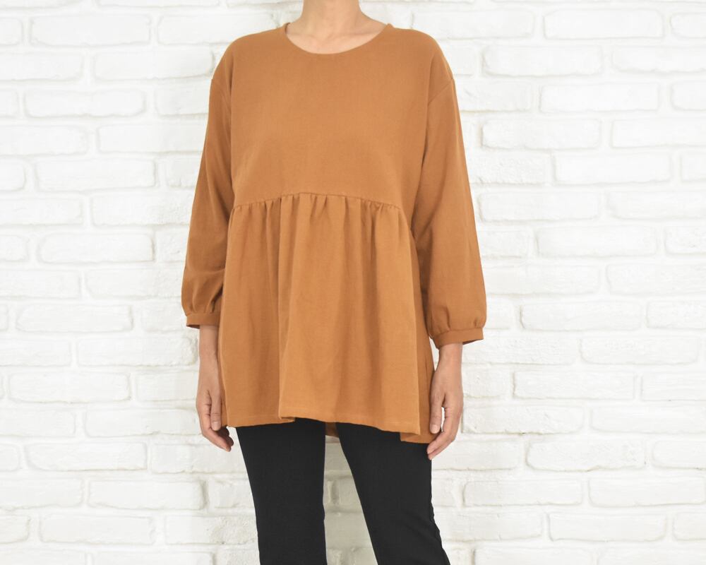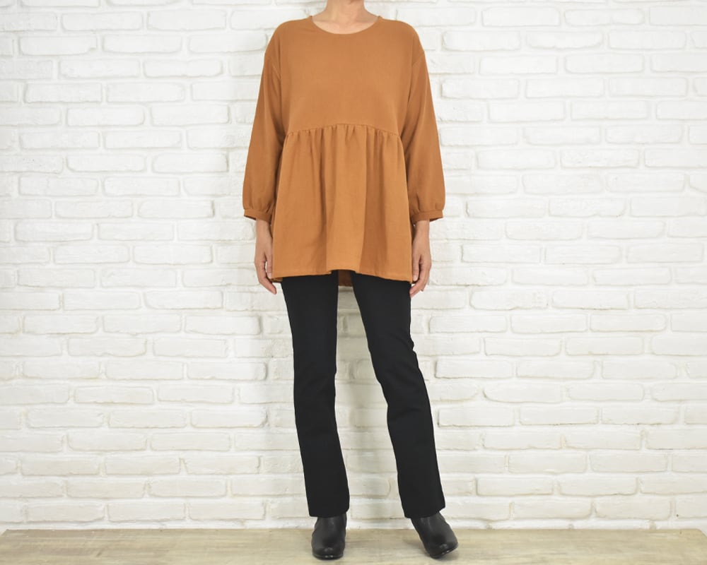 ふんわりとした袖と、胸下切り替えのギャザーが印象的なチュニックブラウス。