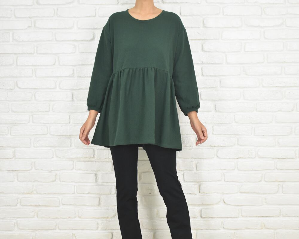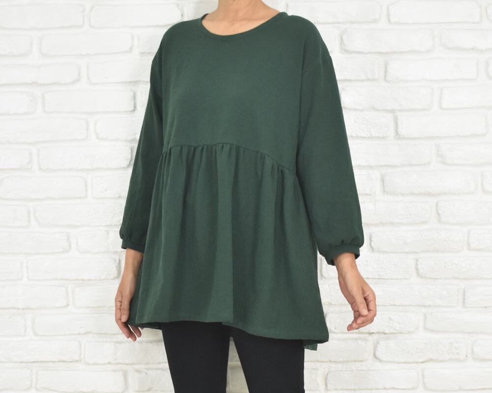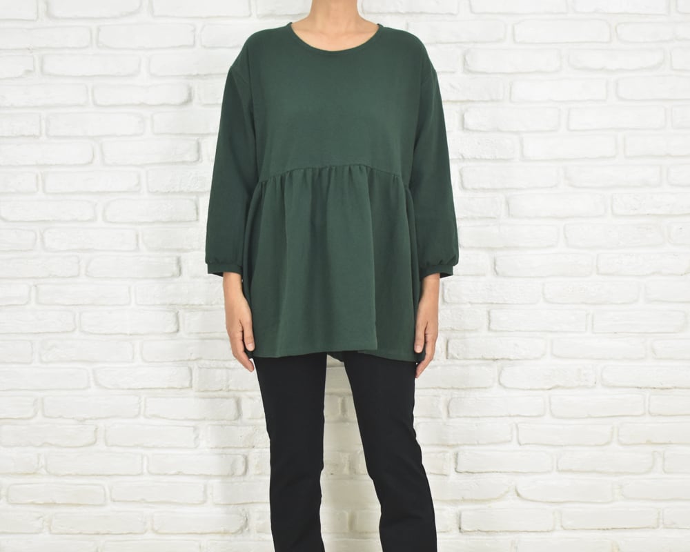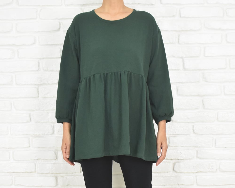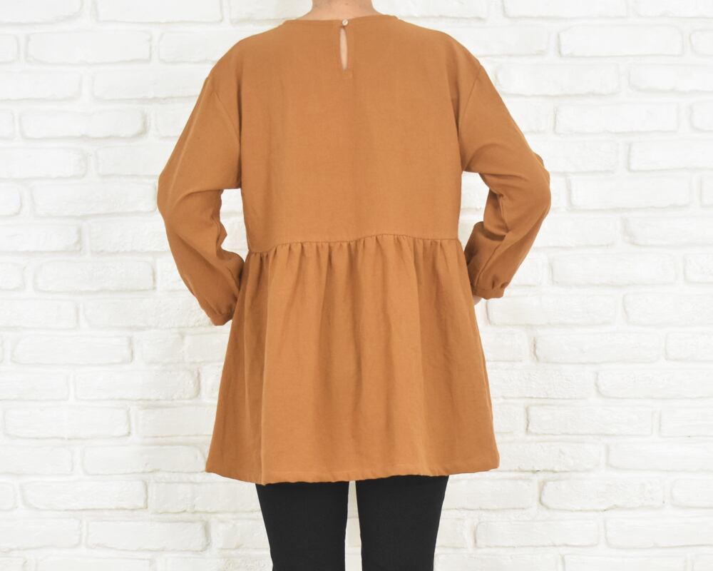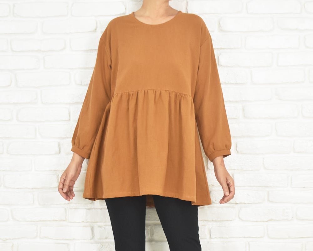 ふんわりとした袖と、胸下切り替えのギャザーが印象的なチュニックブラウス。