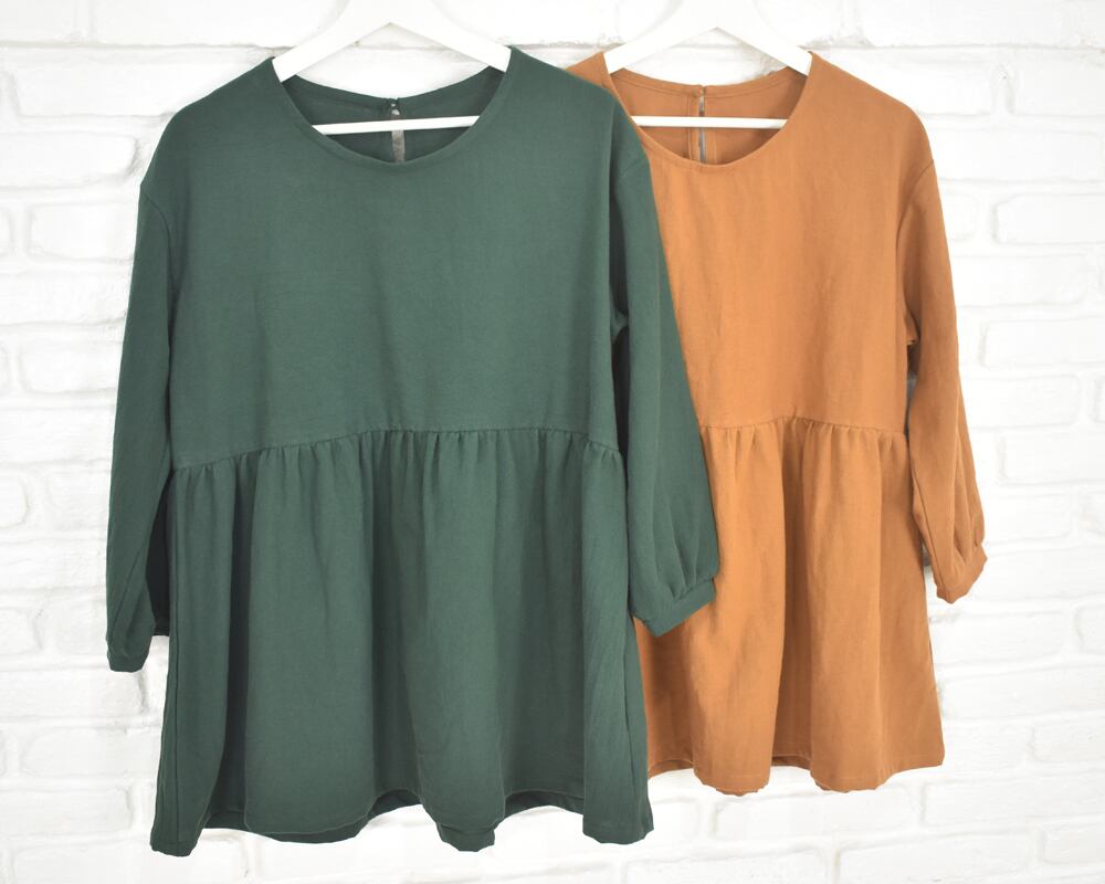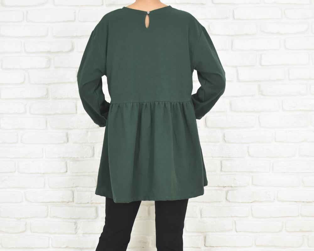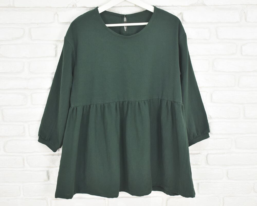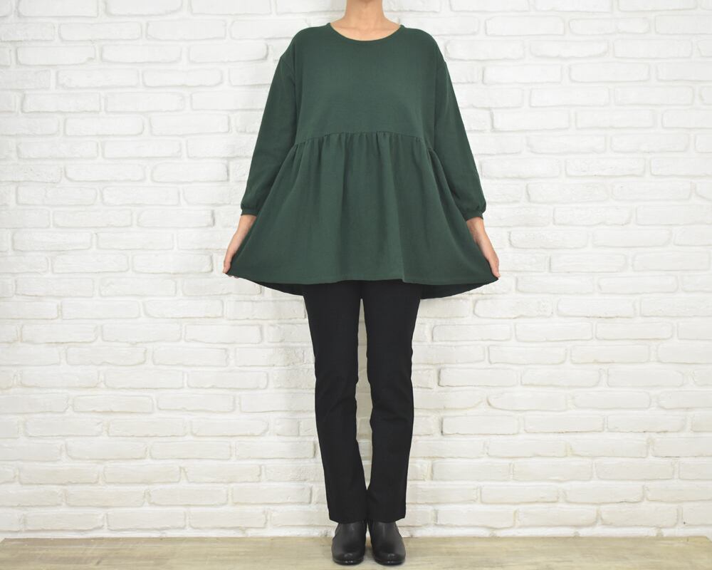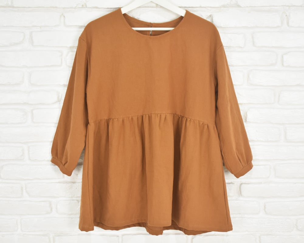 ふんわりとした袖と、胸下切り替えのギャザーが印象的なチュニックブラウス。