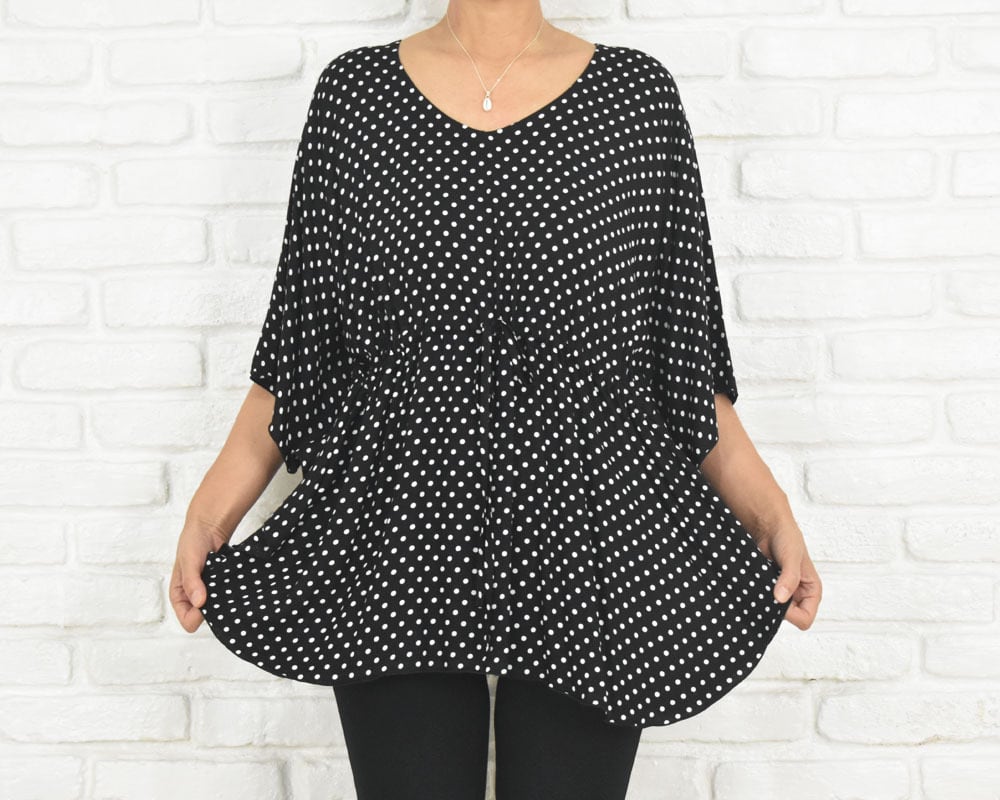 ゆったりリラックスな着心地。体型カバーもできるドット柄バタフライスリーブトップス <ブラック> 水玉